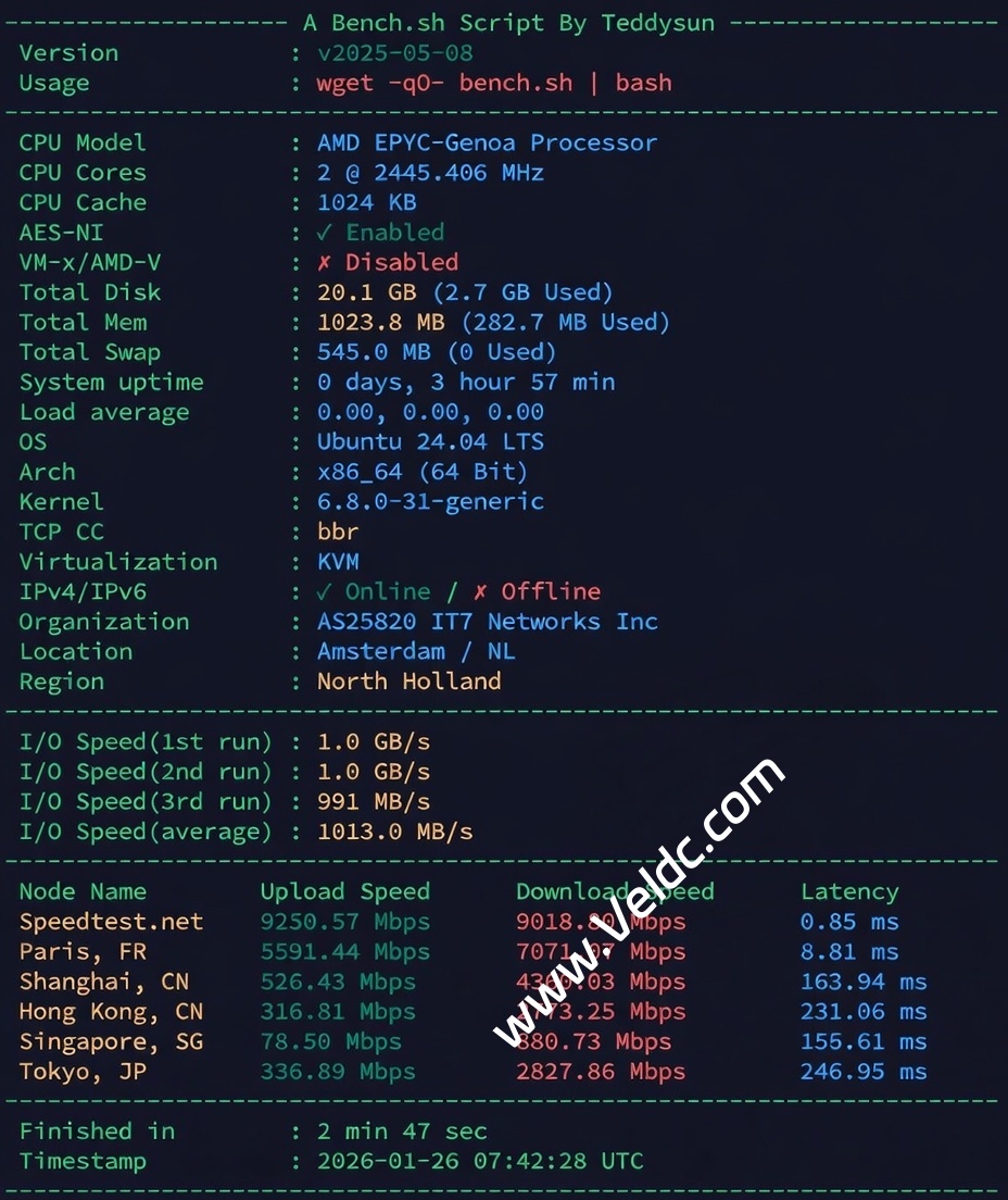 EUNL_1 是搬瓦工于2025年上线的新荷兰阿姆斯特丹机房(全称:NL – Amsterdam DC1),位于荷兰阿姆斯特丹(Amsterdam, Netherlands),数据中心为 Iron Mountain 等高端设施,运营商 AS25820(IT7 Networks Inc.),采用 KVM 虚拟化,该机房三网精品优化:电信走 CN2 GIA,联通高端(AS9929/AS10099/AS10029),移动 CMIN2,回程优质。对国内访问优秀:延迟约 160-180ms,到上海/香港下载速度可达 4Gbps+(实测高峰期表现稳定),欧洲本地/巴黎等节点速度极高(Gbps 级别)。最低入门套餐季付$49.99起,目前可以在购买 CN2 GIA-E 套餐的时候选择,但是购买之后如果迁移到别的机房就没法再迁移回去。此外目前已经购买的 CN2 GIA-E 套餐也无法迁移到 EUNL_1。EUNL_1 是目前搬瓦工荷兰机房中的“三网王炸”,结合欧洲位置优势和中国优化线路,性价比高,稳定性强(企业级硬件,低故障)。如果你需要欧洲 VPS 但不想牺牲国内速度,这是首选!如果追求纯联通优化,可考虑 EUNL_9;高性能 CPU 则选 EUNL_2。建议去官网查看实时可用性。下面是简单测评。
