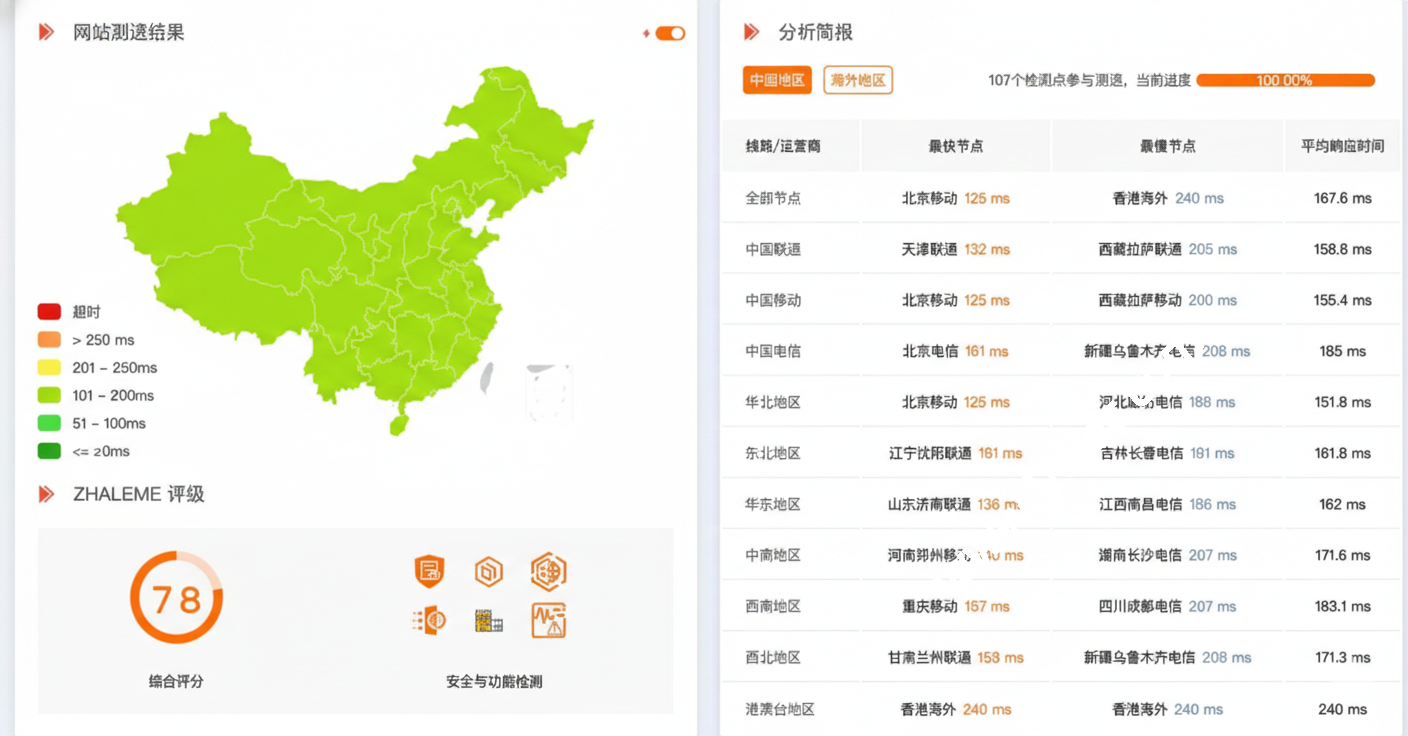 西部地区:西藏等偏远地区延迟约 200 ms,表现依然稳健。