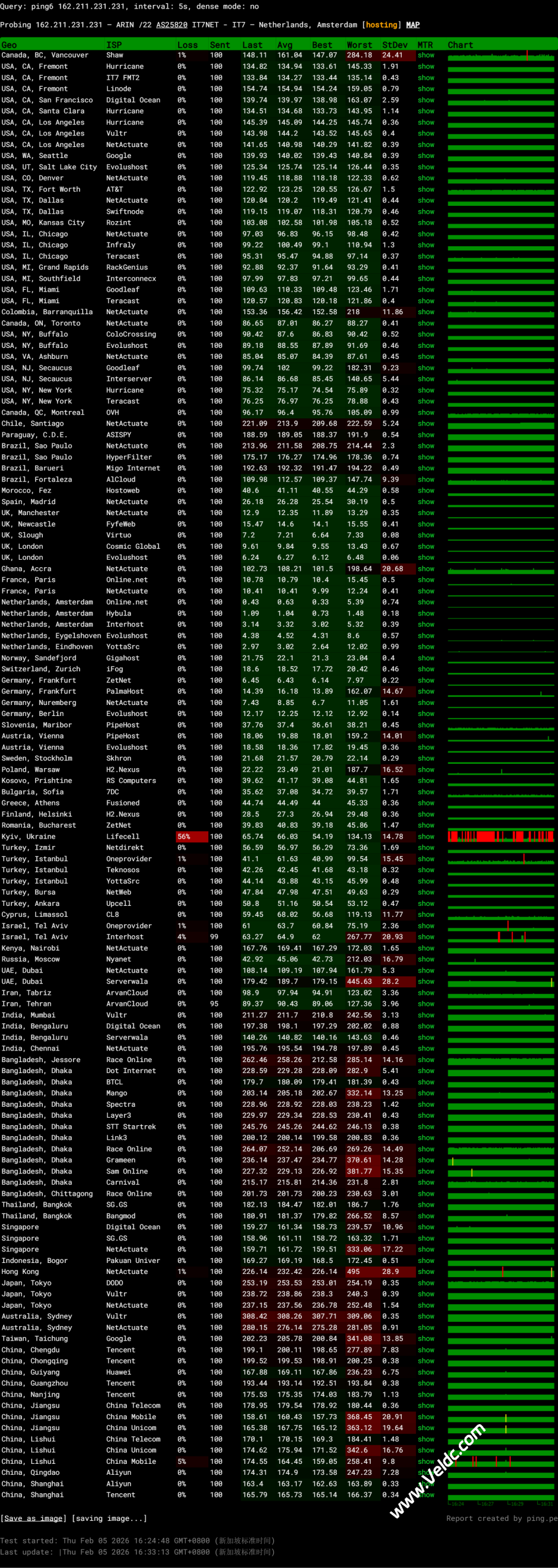 稳定性:全球多节点 Ping 测试显示,除去极个别移动节点(如丽水)有 5% 丢包外,全国核心城市均为 0 丢包,晚高峰稳定性极高。