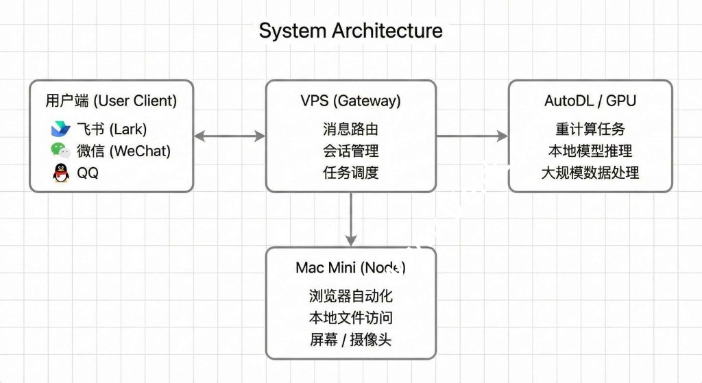 OpenClaw 原生支持 Nodes(节点)机制,可以把其他设备作为 OpenClaw 的”手脚”,Gateway 负责大脑调度,Nodes 负责实际执行。比如浏览器操作可以丢给你的 Mac Mini 去做,代码编译可以丢给 AutoDL 的 GPU 服务器去做,而 VPS 只负责消息路由和任务协调。