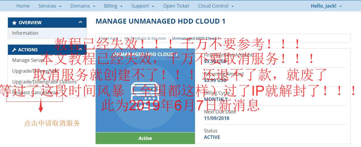 首先Hostwinds VPS不能退款是官网条款写的,确实是这样,客服也告诉你不能退款,但是我们可以1、先取消服务;2、通过邮件确认取消服务;3、提交ticket(工单)申请退款;这里退款不是退到你的支付宝或者银行卡,而是退款到账号余额,你可以通过余额重新购买VPS,新的VPS是重新分配IP。下面我们通过图片示例说一下这几步操作。