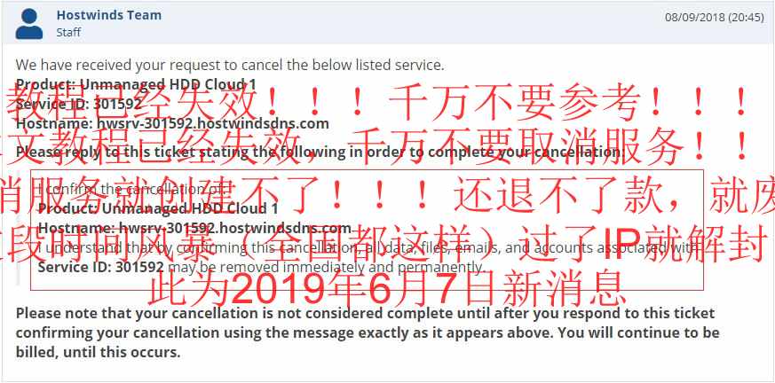 当你确认取消后等待Hostwinds回复,Hostwinds回复你后确认取消你的VPS服务,然后你需要发一封退款邮件申请,但是这个退款是退到你会员中心的金额,不是你的银行卡,你可以用它重新购买VPS。