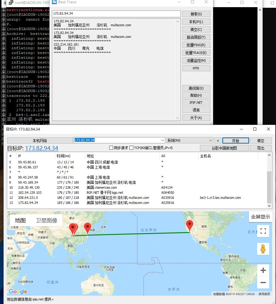 北京天特信科技有限公司开发的 Best Trace 是一款图形化路由跟踪线路测试工具,目前已经涵盖了 Windows、Android、iOS、Mac平台。Best Trace 可对服务器所经过的路由进行可视化检测,并可以准确标注路由所在位置以及 AS 号。支持查询本机 IP、路由监控、批量 Ping 等。