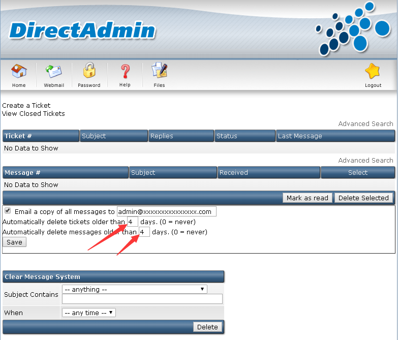 另外,在directadmin自身的目录中还有一份TICKETS保留数据,时间长了会累积的比较大。可以通过以下命令清理。