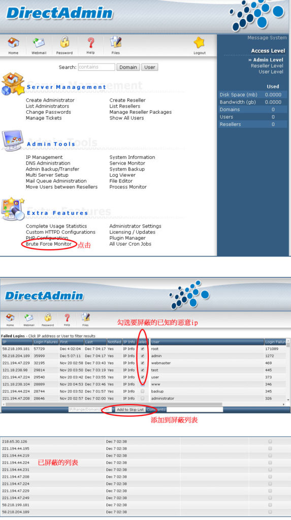 ③ 在操作完1和2后,本次的处理就已经结束,暂时就已经正常了。接下来我们要对directadmin以上的项做优化。以免下次还因此相同的原因造成出错。优化的内容有三项。分别是“定期清理message邮件“,“自动清理brute_log_entries.list的登录日志列表”,“屏蔽已知的恶意ip登录”