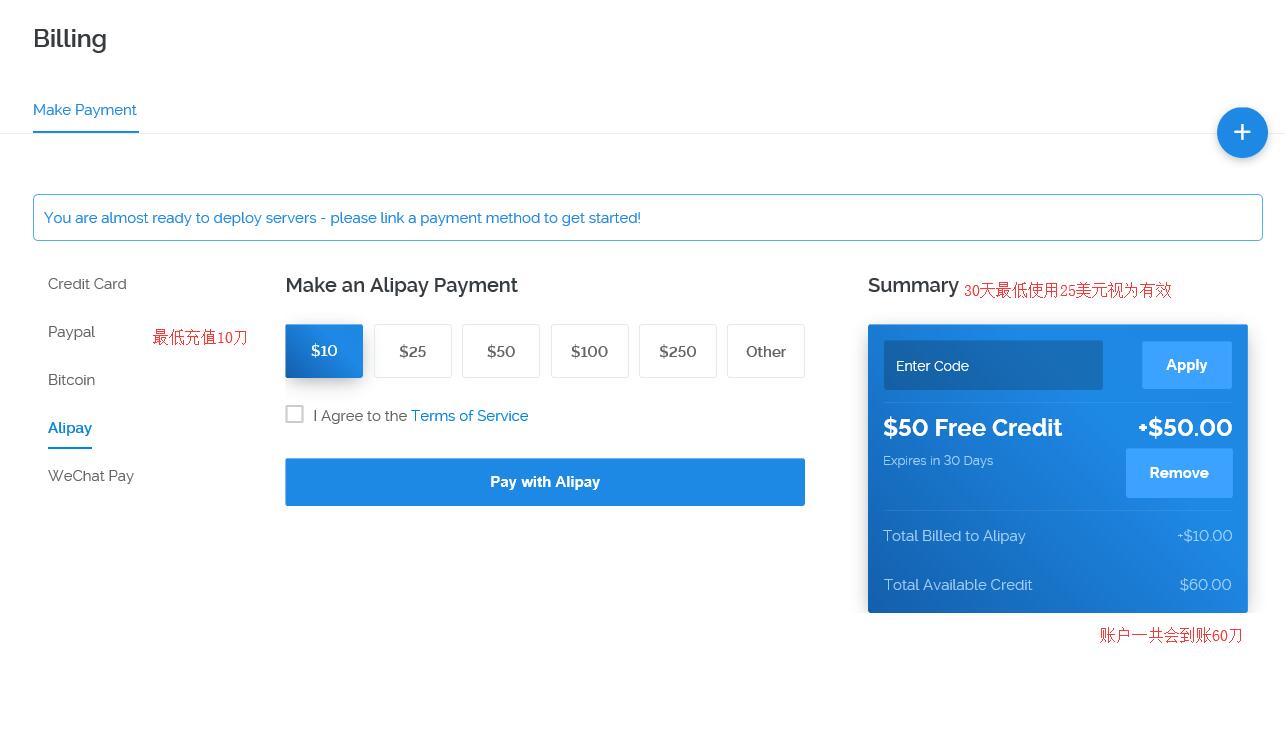 具体规则是「新用户」注册后,进入后台的「Billing」页面,至少充值 10 美元 (信用卡10 美元,支付宝 / 微信支付 / PayPal 等渠道至少充值 10 美元) 才能激活账号。你的账号必须充值后才算“激活”完成,才能获赠使用金。