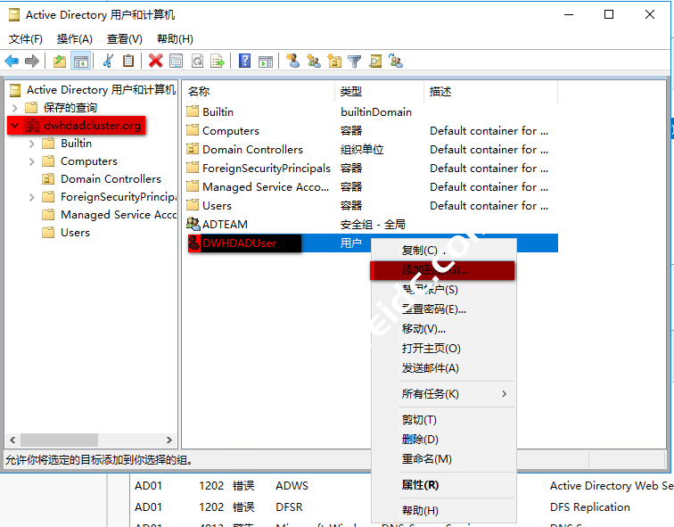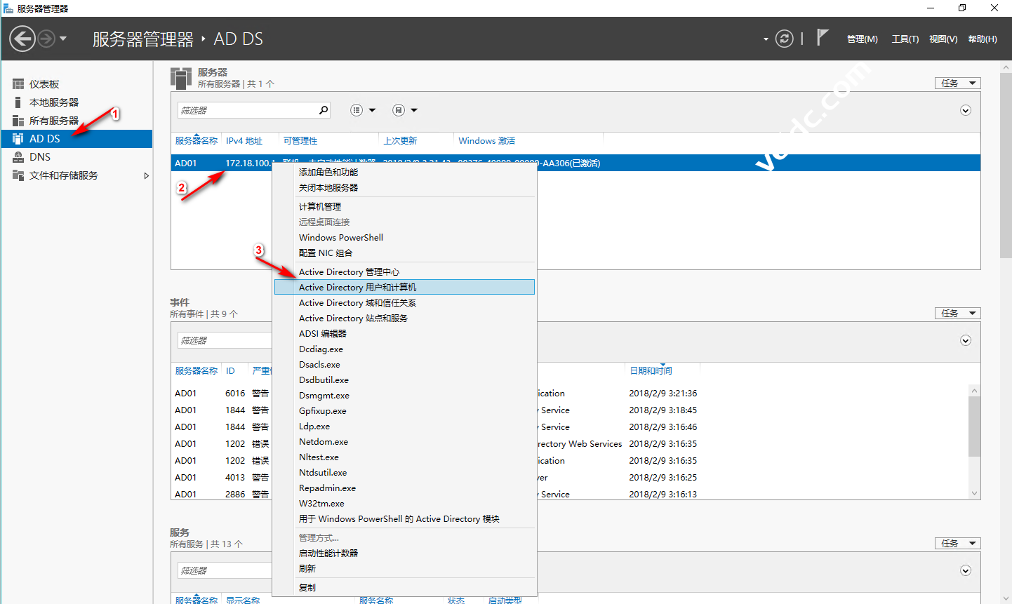 回到服务器管理器界面,然后选择”AD DS“,接着右键选择”AD01“这个节点,在弹出的界面选择“Active Directory 用户和计算机”