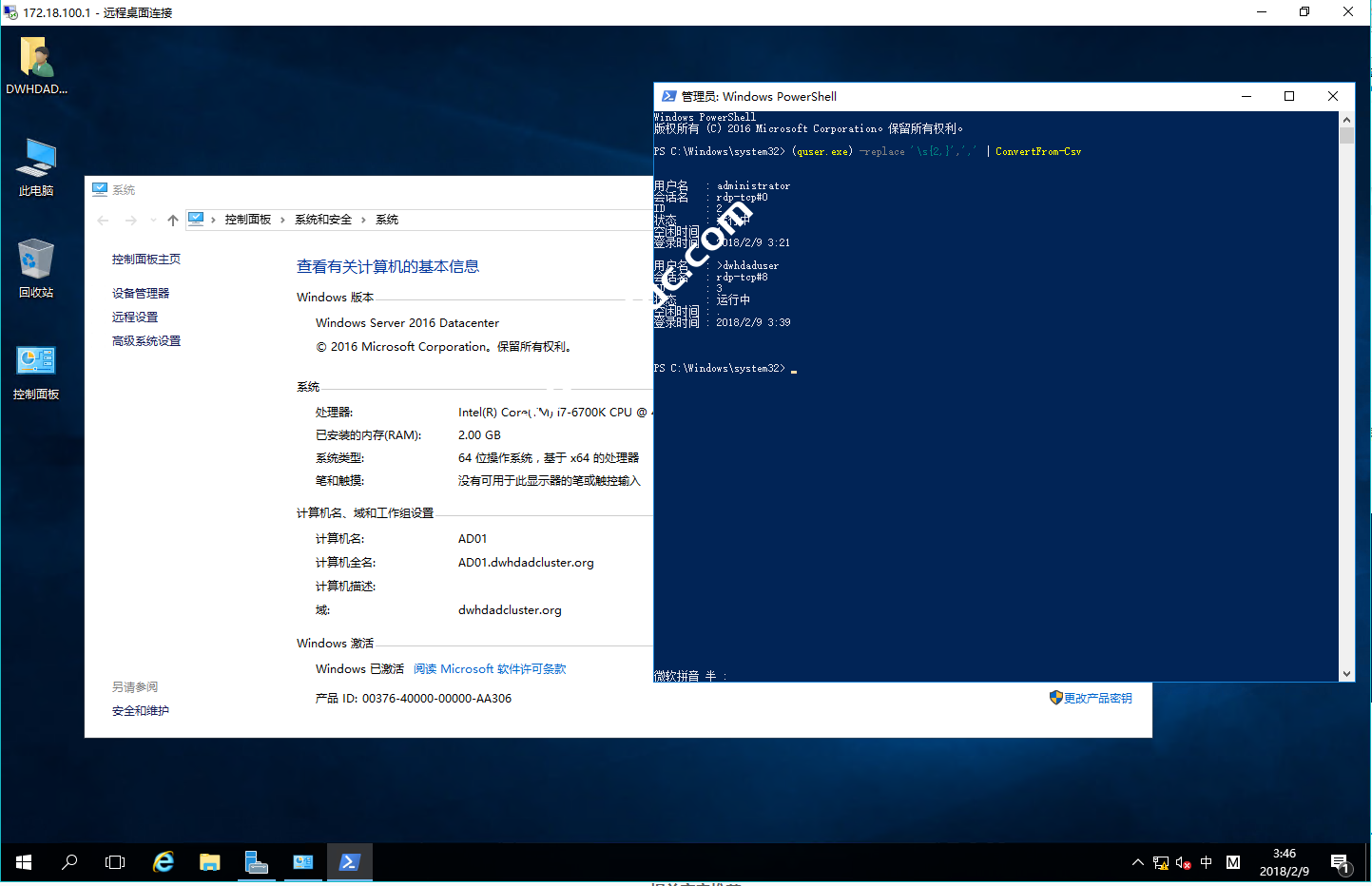 Windows PowerShell版权所有 (C) 2016 Microsoft Corporation。保留所有权利。PS C:\Windows\system32> (quser.exe) -replace '\s{2,}',',' | ConvertFrom-Csv用户名 : administrator会话名 : rdp-tcp#0ID : 2状态 : 运行中空闲时间 : 3登录时间 : 2018/10/22 13:44用户名 : >mnsql会话名 : rdp-tcp#1ID : 3状态 : 运行中空闲时间 : .登录时间 : 2018/10/22 13:51PS C:\Windows\system32> |