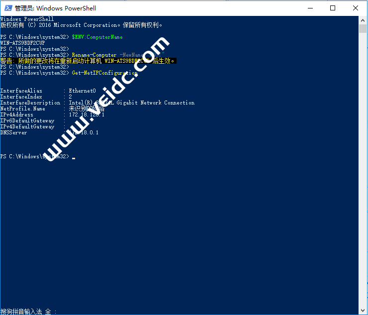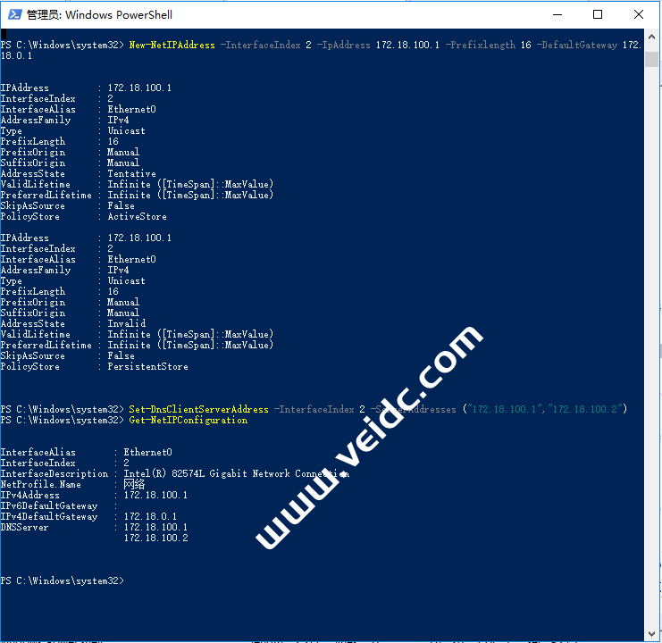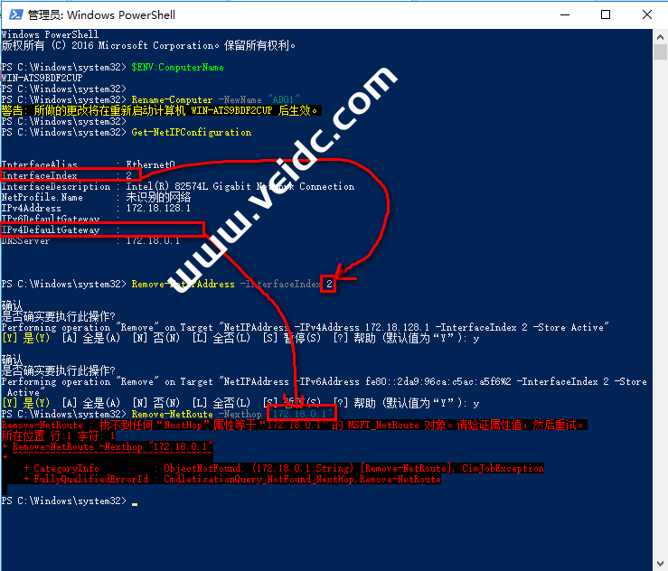 Windows PowerShell版权所有 (C) 2016 Microsoft Corporation。保留所有权利。PS C:\Windows\system32> $ENV:ComputerName #查看计算机名称WIN-ATS9BDF2CUPPS C:\Windows\system32>PS C:\Windows\system32> Rename-Computer -NewName "AD01" #修改计算机名称警告: 所做的更改将在重新启动计算机 WIN-ATS9BDF2CUP 后生效。PS C:\Windows\system32>PS C:\Windows\system32> Get-NetIPConfiguration #获取网络信息InterfaceAlias : Ethernet0InterfaceIndex : 2InterfaceDescription : Intel(R) 82574L Gigabit Network ConnectionNetProfile.Name : 未识别的网络IPv4Address : 172.18.128.1IPv6DefaultGateway :IPv4DefaultGateway :DNSServer : 172.18.0.1PS C:\Windows\system32> Remove-NetIPAddress -InterfaceIndex 2 #删除当前网络配置确认是否确实要执行此操作?Performing operation "Remove" on Target "NetIPAddress -IPv4Address 172.18.128.1 -InterfaceIndex 2 -Store Active"[Y] 是(Y) [A] 全是(A) [N] 否(N) [L] 全否(L) [S] 暂停(S) [?] 帮助 (默认值为“Y”): y确认是否确实要执行此操作?Performing operation "Remove" on Target "NetIPAddress -IPv6Address fe80::2da9:96ca:c5ac:a5f6%2 -InterfaceIndex 2 -Store Active"[Y] 是(Y) [A] 全是(A) [N] 否(N) [L] 全否(L) [S] 暂停(S) [?] 帮助 (默认值为“Y”): yPS C:\Windows\system32> Remove-NetRoute -Nexthop "172.18.0.1" #删除当前路由信息PS C:\Windows\system32> New-NetIPAddress -InterfaceIndex 2 -IpAddress 172.18.100.1 -Prefixlength 16 -DefaultGateway 172.18.0.1 #设置新的网络信息IPAddress : 172.18.100.1InterfaceIndex : 2InterfaceAlias : Ethernet0AddressFamily : IPv4Type : UnicastPrefixLength : 16PrefixOrigin : ManualSuffixOrigin : ManualAddressState : TentativeValidLifetime : Infinite ([TimeSpan]::MaxValue)PreferredLifetime : Infinite ([TimeSpan]::MaxValue)SkipAsSource : FalsePolicyStore : ActiveStoreIPAddress : 172.18.100.1InterfaceIndex : 2InterfaceAlias : Ethernet0AddressFamily : IPv4Type : UnicastPrefixLength : 16PrefixOrigin : ManualSuffixOrigin : ManualAddressState : InvalidValidLifetime : Infinite ([TimeSpan]::MaxValue)PreferredLifetime : Infinite ([TimeSpan]::MaxValue)SkipAsSource : FalsePolicyStore : PersistentStorePS C:\Windows\system32> Set-DnsClientServerAddress -InterfaceIndex 2 -ServerAddresses ("172.18.100.1","172.18.100.2") #设置新的DNS信息PS C:\Windows\system32> Get-NetIPConfiguration #获取网络信息以便校验InterfaceAlias : Ethernet0InterfaceIndex : 2InterfaceDescription : Intel(R) 82574L Gigabit Network ConnectionNetProfile.Name : 网络IPv4Address : 172.18.100.1IPv6DefaultGateway :IPv4DefaultGateway : 172.18.0.1DNSServer : 172.18.100.1 172.18.100.2PS C:\Windows\system32> |