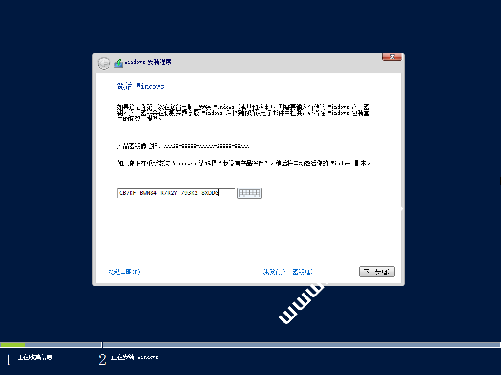 2:由于2016和2012、2008系统镜像Microsoft官方做了调整,如果你想使用VL的镜像这里建议在这一步的时候就输入VL的密钥,不然后期换VL版本想当的麻烦,这也是为什么在这个教程中把系统安装步骤都说一下的原因。