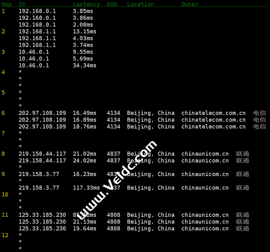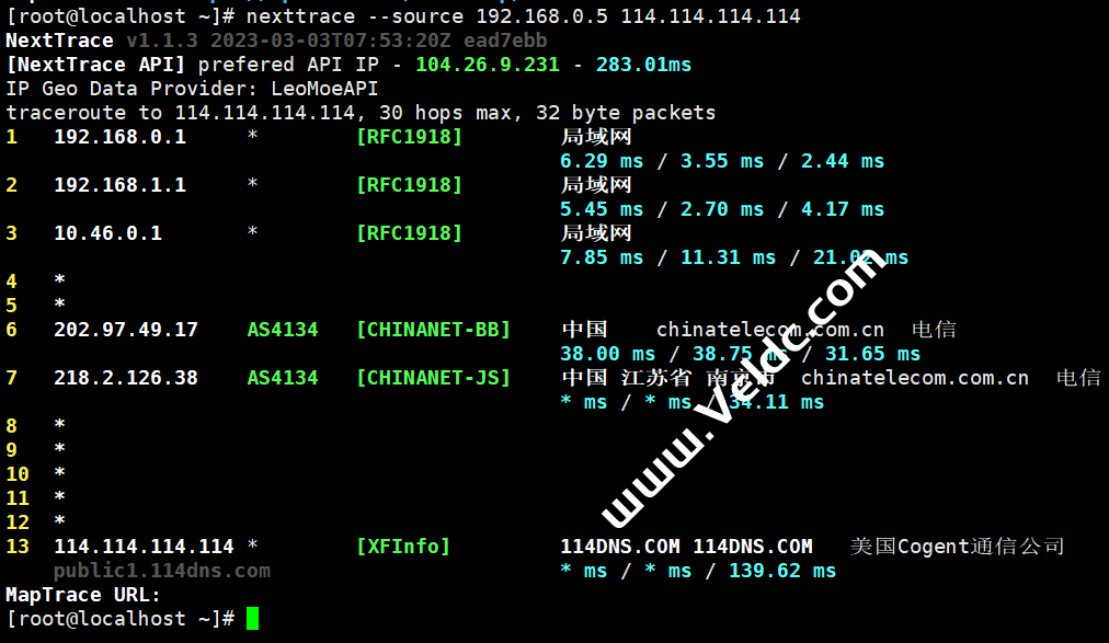 # 使用 ens32 网卡IP # 使用网卡 IP 进行路由跟踪时需要注意跟踪的 IP 类型应该和网卡 IP 类型一致(如都为 IPv4) nexttrace --source 192.168.0.5 114.114.114.114