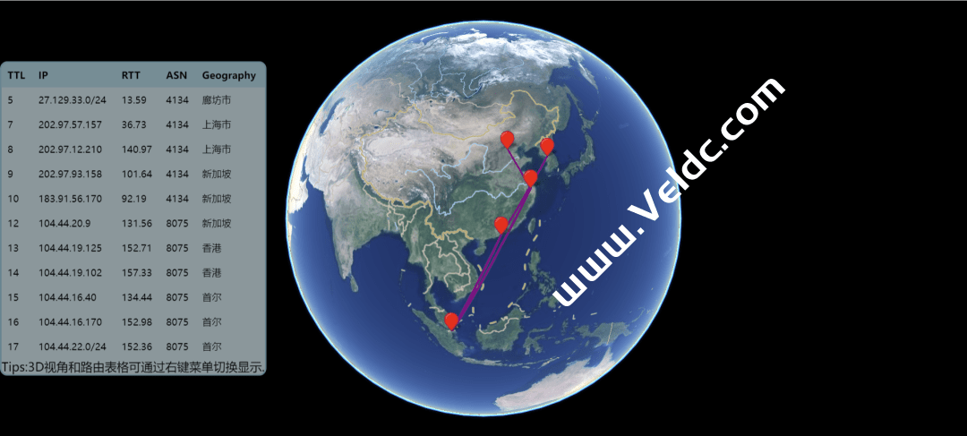 它基于 nexttrace 命令通过命令行显示类似于 traceroute 清晰的路由信息。当执行完一条追踪的路由信息时,会自动生成 MapTrace URL 也就是一个 HTML,通过浏览器访问该 URL 支持以地图或 3D 视角的方式可视化展示。