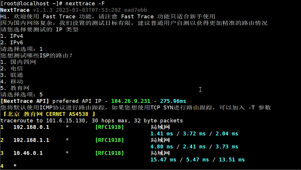 # 测试 ISP 的路由:国内四网、电信、联通、移动、教育网、测试 IP 类型:IPv4 / IPv6 的 ICMP 快速测试 nexttrace -F