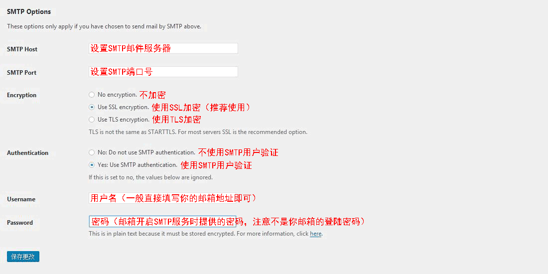 如果上面Mailer设置中你选择了Send all WordPress emails via SMTP选项,那么就会出现SMTP Options的设置。这个面板是我们这次试用这个插件的重中之重,大家仔细注意下,如果这地方设置错了,邮件将依旧无法发送!
