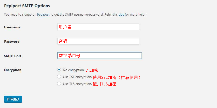 如果上面Mailer设置中你选择了Use Pepipost SMTP to send emails选项,那么就会出现该选项的设置。不过我个人是没有使用这种方式发送邮件的,所以对这个功能不是太了解,为了使得这篇文章更加完整一些,特将该面板下的各选项翻译一些,想来设置方法应该与SMTP Options选项类似,大家如果有想使用这种方式设置邮件发送方式的可以参考下前面的内容。