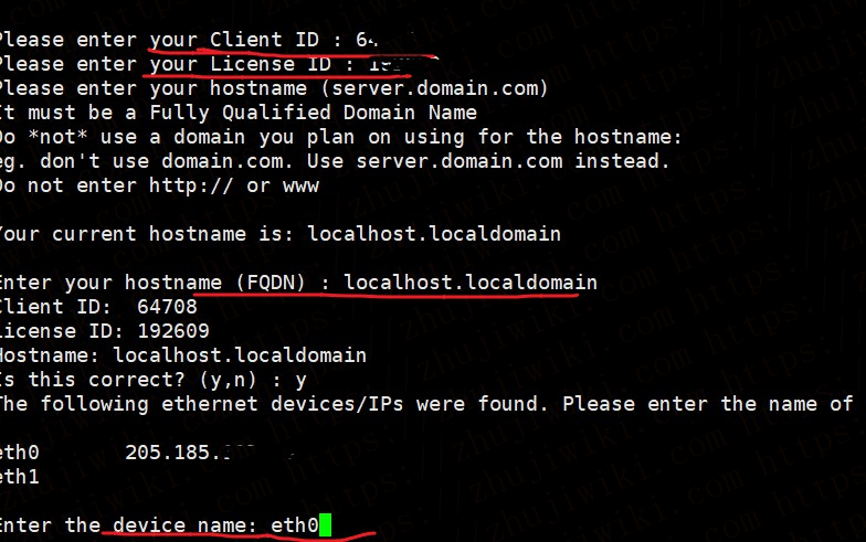安装过程中,会要求输入DirectAdmin的Client ID、License ID、主机名(不要使用将要用的域名作为主机名)、网卡