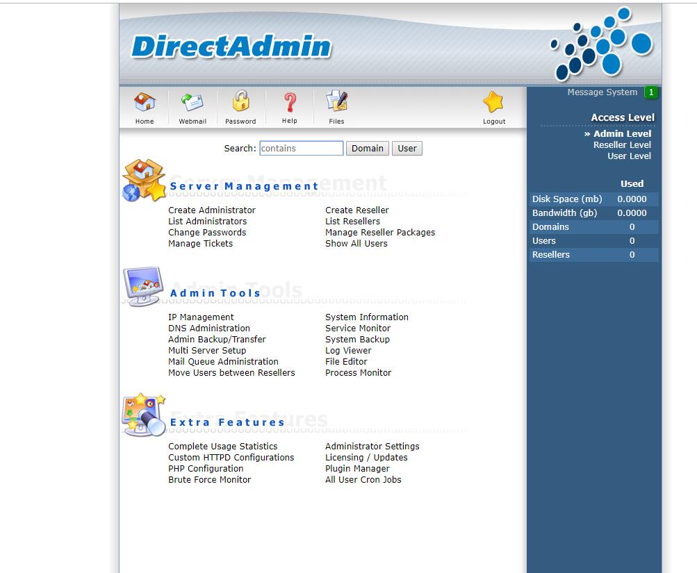 默认是英文界面的,关于汉化和安装新皮肤可以查看之前写的一篇文章:Evolution – DirectAdmin 官方新皮肤/新模板/中文汉化