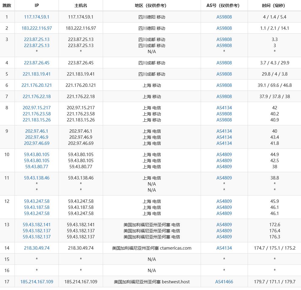 移动看了一下也是走电信出口: