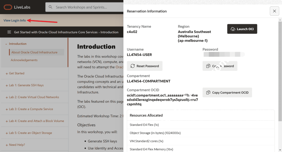 6、点击“View Login Info”,然后复制密码,点击“Launch OCI”按钮即可