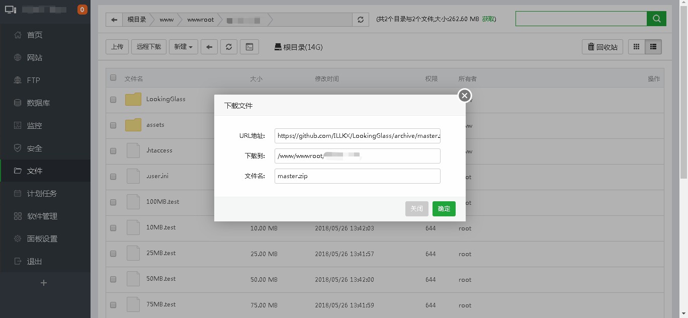 - 然后打开网站根目录,把所有文件删除,将网站文件https://github.com/ILLKX/LookingGlass/archive/master.zip 下载下来,可以用wget或者宝塔页面直接下载