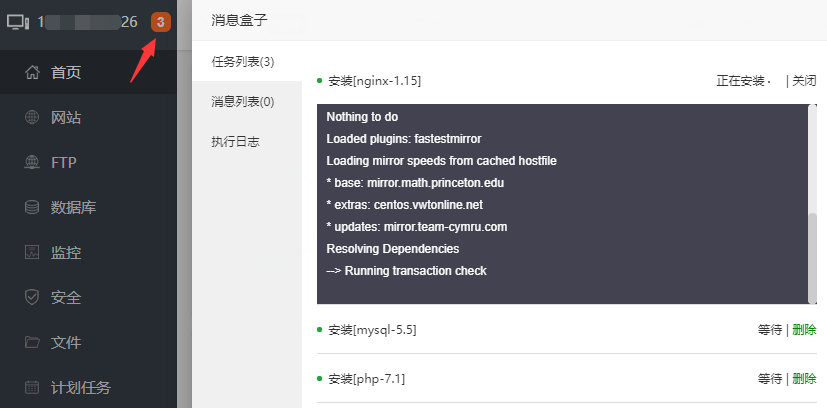 安装环境的时候等待时间可能会有点长,视服务器配置有关。可以点击左上角红色的消息盒子查看进度,也可以通过左侧软件管理查看进度。