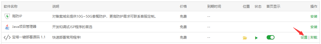 安装完成后,点击左侧软件管理-宝塔插件,安装宝塔一键部署源码,装好后点击设置。
