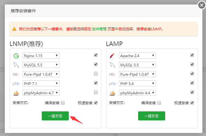 这里建议选择LNMP,环境为Nginx 1.15、PHP 7.2、Mysql 5.5,如果内存1G建议选择Mysql 5.6、2G选择5.7。选择好了后点击一键安装即可。