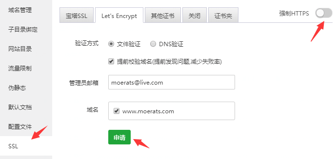 如果你还想域名有逼格点,比如浏览器那里显示一把小绿锁,那么再点击域名设置,找到SSL,填入邮箱,点击申请,然后再开启右上角的强制HTTPS。