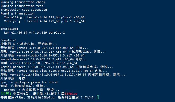 3.原有内核卸载完毕,新内核安装成功后,会出现下图提示重启,输入Y回车: