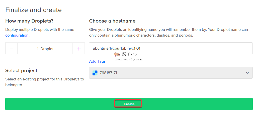 3、最后点击下图红框位置创建即可。VPS的ROOT密码会发送到你的注册邮箱,首次SSH链接VPS会提示更改密码,大家按步骤设置即可。