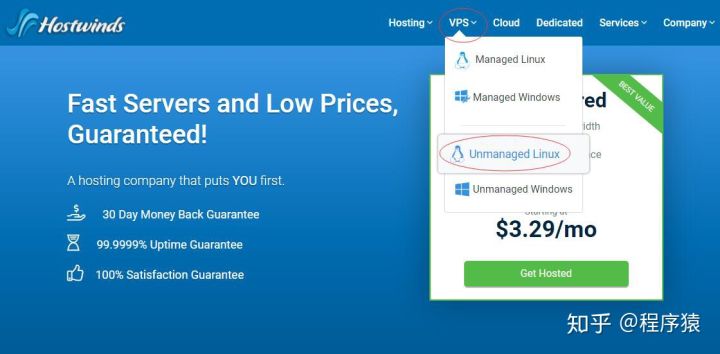 1、通过Hostwinds 优惠链接进入Hostwinds 首页,选择“VPS”下的”Unmanaged VPS”,这里是最便宜的(没有必要买Managed VPS,贵而且没有用)。