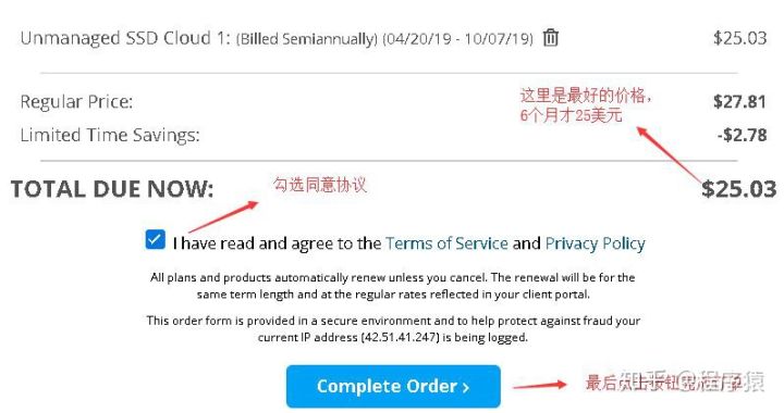8、最后确认价格(不同时期可能价格有些许不同,如果通过前面优惠链接点击购买会有优惠),勾选同意协议,然后点击“Complete Order”按钮进行下单, 如下图所示:
