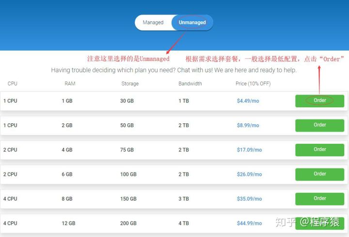 2、进入VPS选择页面后,根据自己的需要的配置选择套餐,一般我们选择最低配置就够用了,然后点击“Order”按钮进入信息填写页面,如下所示:
