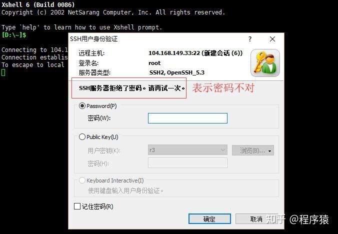 如果显示SSH服务器拒绝了密码,如下图使用Xshell连接的显示示意图: