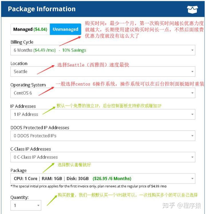 5、然后选择购买时间、数据中心、操作系统,红色部分需要自己选择,绿色一般我们默认,可以按月购买,但是建议第一次购买时间选择长一点,这样优惠要大很多,不然后面续费优惠力度就没有这么大了。 如下图所示: