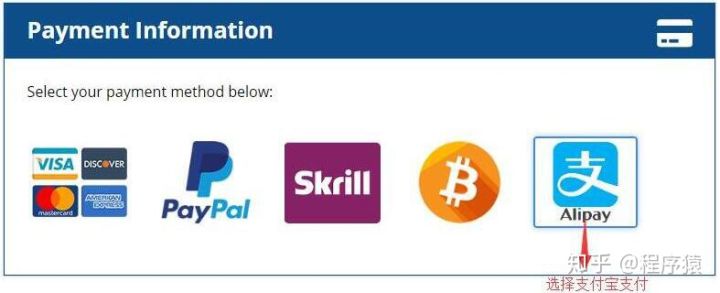 7、然后选择付款方式,一般我们选择支付宝进行付款 (只有国内IP访问的时候才有支付宝付款方式),如下图所示: