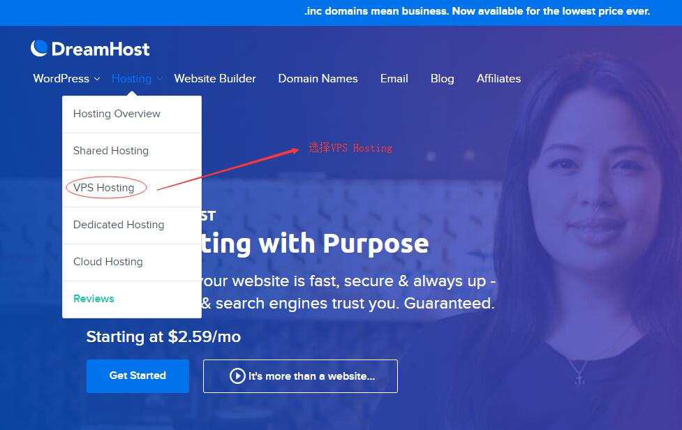 通过 DreamHost 最新优惠链接,进入官网首页,然后选择“Hosting”下的“VPS Hosting”,如下所示: