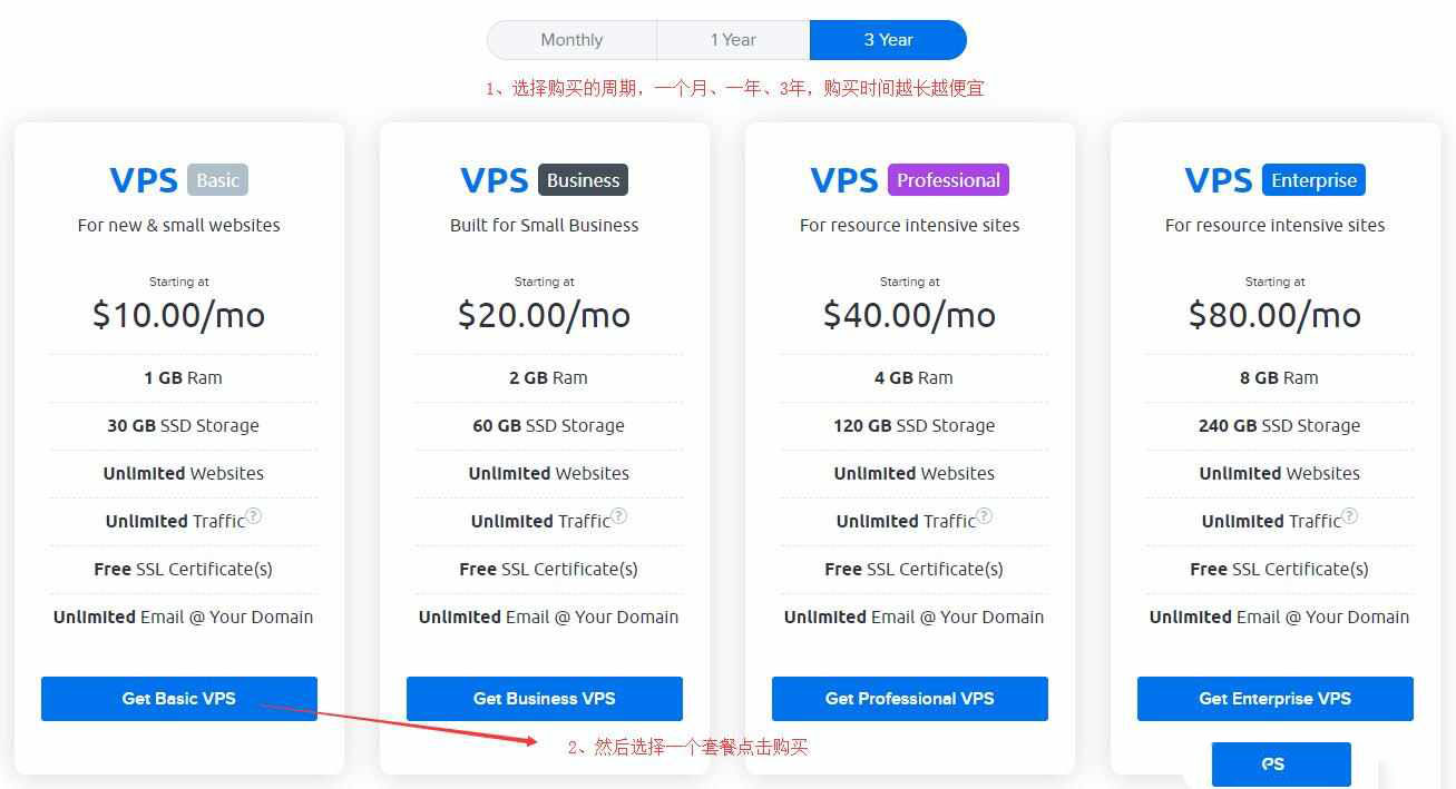 然后选择购买的时间,购买时间越长,就越便宜,然后选择一种配置的套餐,点击购买,如下图所示: