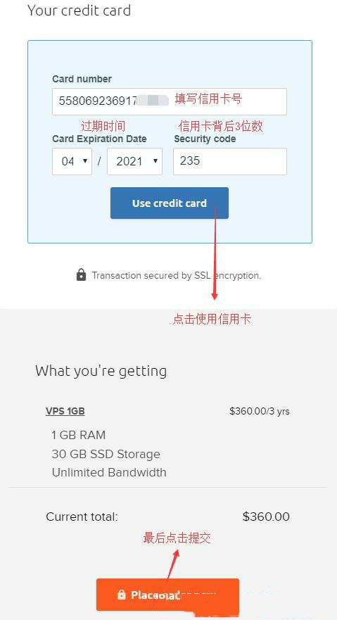 然后填写信用卡信息,使用信用卡,最好点击按钮提交订单,如下图所示: