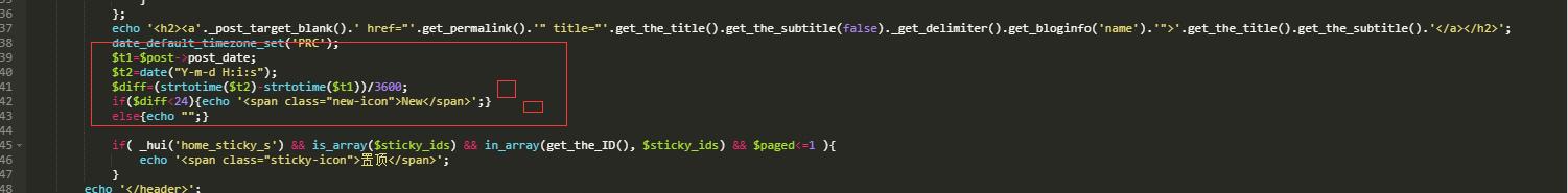 date_default_timezone_set('PRC'); $t1=$post->post_date; $t2=date("Y-m-d H:i:s"); $diff=(strtotime($t2)-strtotime($t1))/3600; if($diff<24){echo '<span class="new-icon">New</span>';} else{echo "";}