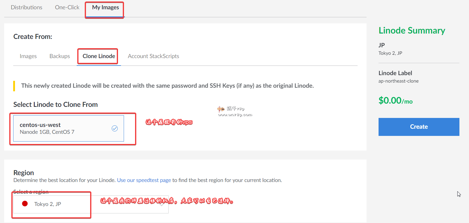 以及选择好新开vps的配置。这里需要注意的是高配方案不能克隆到低配方案。选择完成后点击上图的“Create”进行创建。