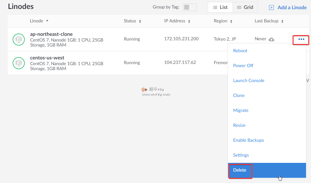 5、克隆完成后最后一步是删除老vps防止扣费。这样就在保留数据的情况下完成了机房切换和IP更换。